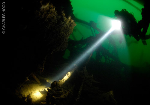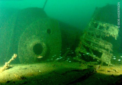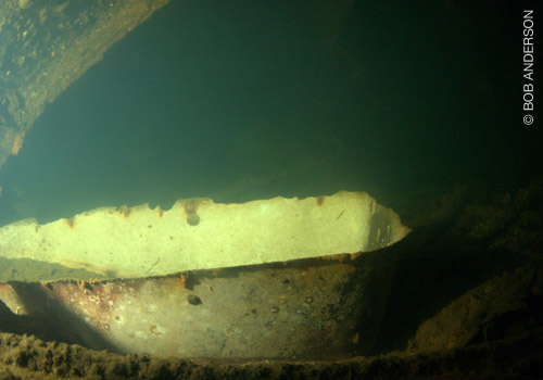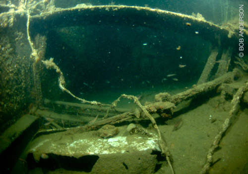 Lying away from the wreck is the port anchor. The anchor chain snakes back toward the wreck and through the port side hawse pipe. Behind the stem of the ship, which slopes up toward the keep at an angle of 30 degrees, is the ship's shield. At the rear of the shield is the massive mould where the anchor would have been stowed.