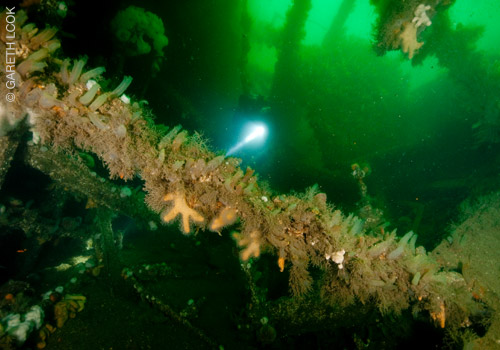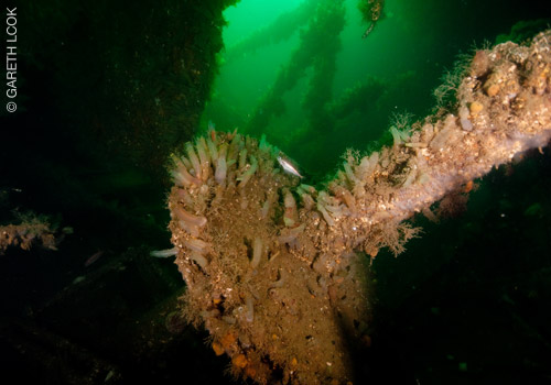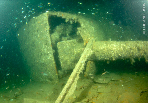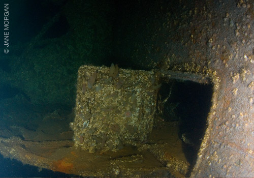 At this point massive davits overhang from their fixed position on the port edge of the ship. The davits, which would have been used to lower the ship's pinnaces, now punch into the seabed below. An engine, a boiler and some hard machinery are all that remain from one of the ship's pinnaces.